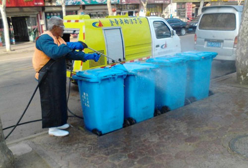 洗桶車自帶清水4.5噸,可一次清洗250個(gè)垃圾桶,洗下來的污水還能存在車內(nèi),絕對不造成污染。
