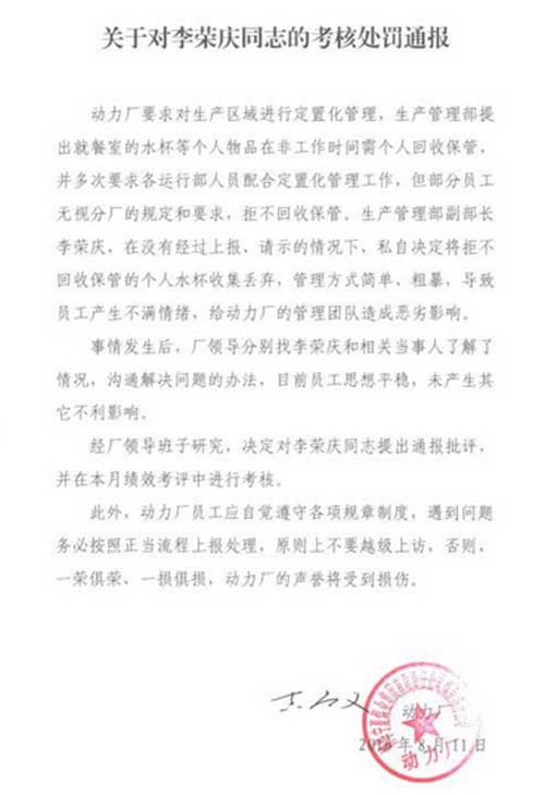 動力廠一名工作人員提供的一份《關(guān)于對李榮慶同志的考核處罰通報(bào)》顯示,該廠生產(chǎn)管理部提出就餐室的水杯等個(gè)人物品在非工作時(shí)間由個(gè)人回收保管,但部分員工無視此規(guī)定和要求,拒不回收保管。李榮慶在沒有經(jīng)過上報(bào)請示的情況下,私自決定將拒不回收保管的個(gè)人水杯收集丟棄,管理方式簡單粗暴,導(dǎo)致員工產(chǎn)生不滿情緒,給動力廠的管理團(tuán)隊(duì)造成惡劣影響。