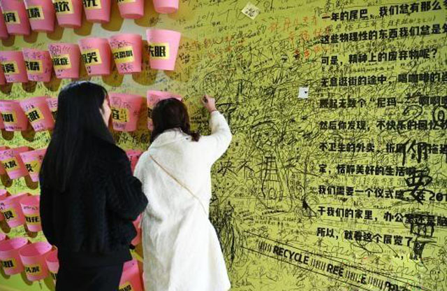 除了這些垃圾收集裝置,垃圾箱內(nèi)的三面?zhèn)葔偷孛嬉渤蔀槭忻裥沟钠脚_(tái),寫滿了戳心的留言。如“扔掉和我媽的溝通不暢”“2018我抑郁癥了,話更少了,希望你不要離開(kāi),一起去馬來(lái)西亞”……字字句句都反映出當(dāng)代年輕人的生活壓力,以及對(duì)輕松、快樂(lè)的渴望。