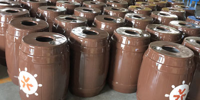 景區(qū)玻璃鋼仿木桶組合分類垃圾桶廠家批量生產(chǎn)圖