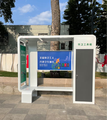 環(huán)衛(wèi)工人休息亭由環(huán)衛(wèi)工具箱和休息座椅組成,讓環(huán)衛(wèi)工人累了能休息、雨天有庇護(hù)。增加環(huán)衛(wèi)工人的休息場(chǎng)所,不斷提升他們的獲得感與幸福感。