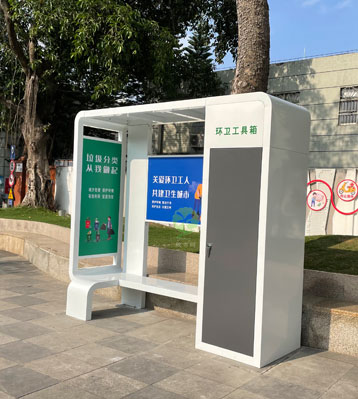 深圳大浪街道這款環(huán)衛(wèi)工人休息歇腳亭,由大浪街道黨工委決定由街道市政中心牽頭設(shè)計(jì),集環(huán)衛(wèi)工具箱和休息座椅實(shí)用性功能于一體,欣方圳工廠生產(chǎn)...